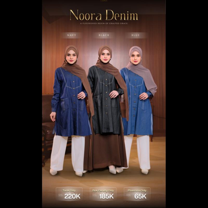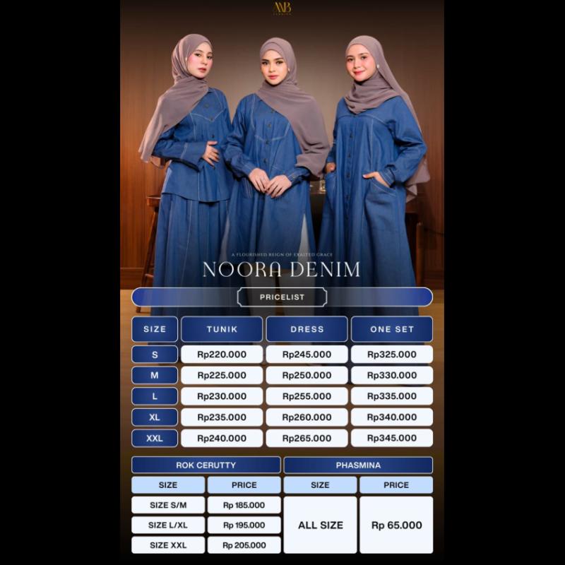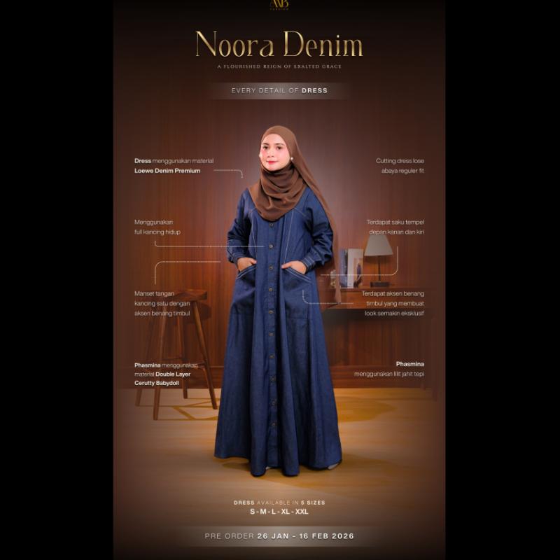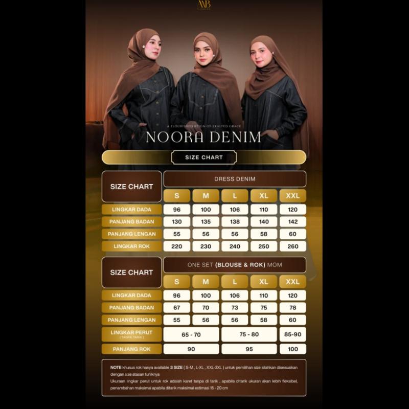 • NOORA DENIM • Open Pre Order : 26 Januari - 16 Februari 2026 _*“First time always leaves a mark”*_ Untuk pertama kalinya, ANB memperkenalkan Denim Series— bukan hanya sekadar denim, tapi cerita tentang berani melangkah ke hal baru ✨ Denim Series First Time lahir dari keinginan untuk menghadirkan artikel yang lebih exclusive. Cocok dipakai harian, cocok untuk formal dan non formal, dan tetap terasa nyaman tanpa harus berlebihan. Cuttingan yang exclusive , material yang lembut namun tetap kokoh menjadikan Denim Series ini sebagai *First Exclusive series ANB di 2026 ini* ✨ So you must have ‼️ DESKRIPSI PRODUK DRESS : ~ Menggunakan material loewe denim premium ~ Menggunakan full kancing hidup ~ Cutting dress lose abaya reguler fit ~ Terdapat saku tempel depan kanan dan kiri ~ Terdapat aksen benang timbul yang membuat look makin exclusive ~ Manset tangan kancing satu dengan aksen benang timbul TUNIK : ~ Menggunakan material loewe denim premium ~ Menggunakan full kancing hidup ~ Menggunakan kerah kemeja casual ~ Terdapat aksen benang timbul yang membuat look semakin exclusive ~ Tunik dengan aksen belah samping bagian rok kanan dan kiri ~ Pola cutting yang exclusive ~ Manset tangan kancing satu dengan aksen benang timbul ONE SET : ~ Menggunakan material loewe denim premium ~ Menggunakan full kancing hidup ~ Menggunakan kerah kemeja casual ~ Cutting blouse reguler fit ~ Manset tangan kancing satu dengan pola cutting trumpet sleeve ~ Rok dengan cutting standar A line dan aksen benang timbul vertikal membuat efek jenjang ~ Terdapat saku samping kanan di bagian rok ~ Rok menggunakan karet dibagian lingkar belakang yang adjustable ROK CERUTTY : ~ Menggunakan material double layer cerutty babydoll ~ Full karet dibagian pinggang yang adjustable ~ Cutting rok semi klok ~ Available 2 warna ( Mauve & Choco ) PHASMINA : ~ Menggunakan material double layer cerutty babydoll ~ Ukuran phasmina All size 180cm x 73 cm ~ Menggunakan lilit jahit tepi ~ Available 2 warna ( Mauve & Choco ) Availabe 5 size : S/M/L/XL/XXL ( Dress Tunik Blouse ) Available 3 size : S-M / L-XL / XXL ( Rok denim & Cerutty ) Availabe 3 warna : • Black • ⁠Navy • ⁠Blue Pricelist : Tabel terpisah First time always matters ✨ Dan temukan cerita Denim Series bersama ANB ✨ #ANBFirstDenim#ANBDenimLaunch#FirstTimeDenim#DenimModest#ModestDenimStyle#PremiumDenimWear#TimelessDenim